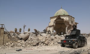 FacebookTwitterPinterest An armoured vehicle sits among the ruins of the Great Mosque of al-Nuri, destroyed by Isis, in Mosul. Photograph: Anadolu Agency/Getty Images