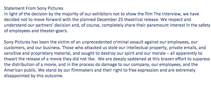 The biggest news today centers around the decision of several theatre chains canceling the movie premier of ‘The Interview’. According to CNN, AMC Entertainment, Regal (RGC), Cinemark (CNK), Carmike Cinemas (CKEC), Bow Tie Cinemas and Southern all dropped the movie that was to open on December 25th. This prompted Sony to officially cancel both the New York premiere and the general the release as well, according to a Sony statementposted by Mark Day. In the statement, Sony refers to the attack against their network as “unprecedented” even though there is clearly precedent for such large scale intrusions. Roger Grimes at InfoWorld also makes this point in an article, speaking from his own experience performing computer security reviews after attacks.