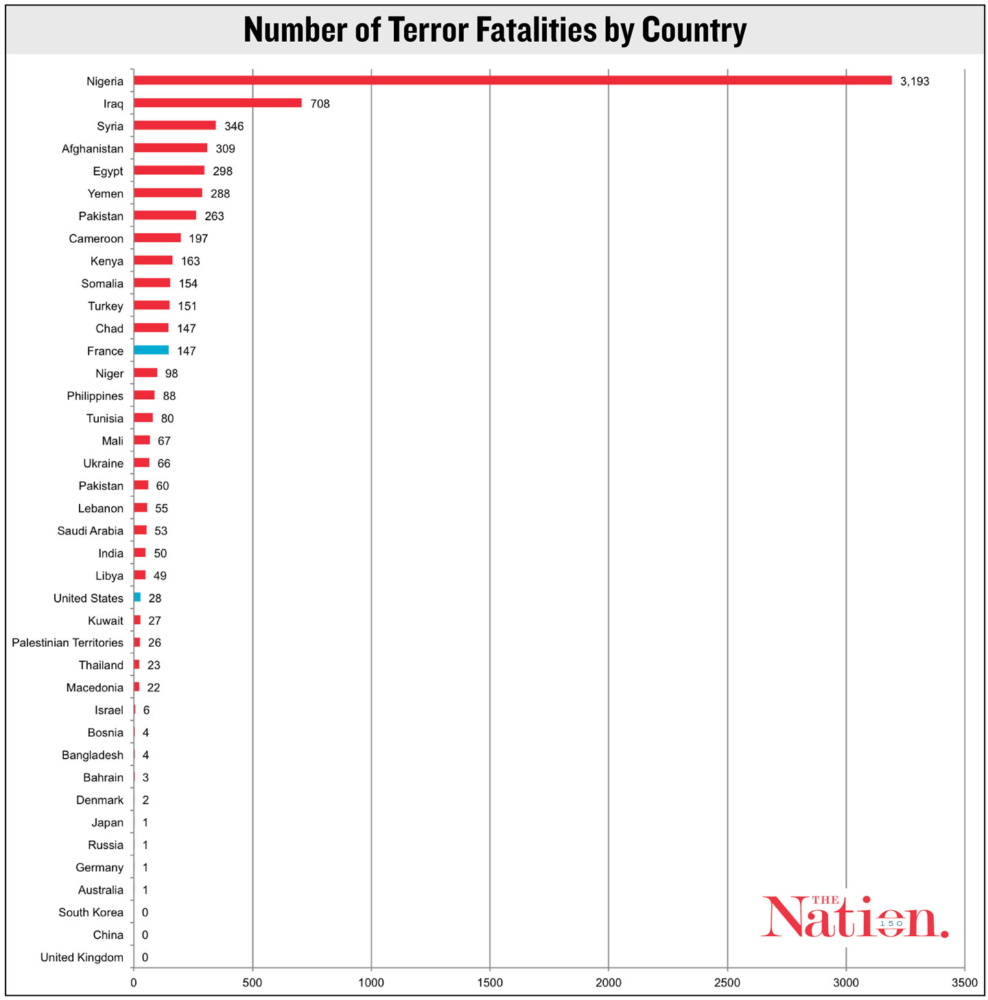 And almost all of these largely unreported major terrorist attacks were in non-Western countries. Of the 26 incidents in which 50 or more people died, only one happened in the West—the November attack in Paris. Of the remaining 25, 13 were in Africa (with 9 in Nigeria alone) and 11 were in the Middle East (with 4 in Iraq).
