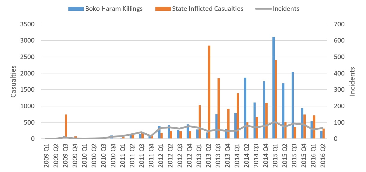 A close look at the data, drawn from Johns Hopkins University’s Nigeria Social Violence Research Project, reveals four key factors behind Boko Haram’s decline: a failure to spread much beyond Nigeria’s extreme northeast, a loss of popular support, poor strategic thinking by the insurgents, and improved counterinsurgency operations. Though these factors have led to a decisive shift in momentum against the group, the conflict is far from over. Winning the war will require better regional coordination, the re-integration of former militants, and a systematic plan to re-build the northeast, where thousands are currently on the brink of starvation.Figure 1. Quarterly Casualties and Incidents in the Boko Haram Insurgency, 2009-2016 (Source: Johns Hopkins University Nigeria Social Violence Database).
