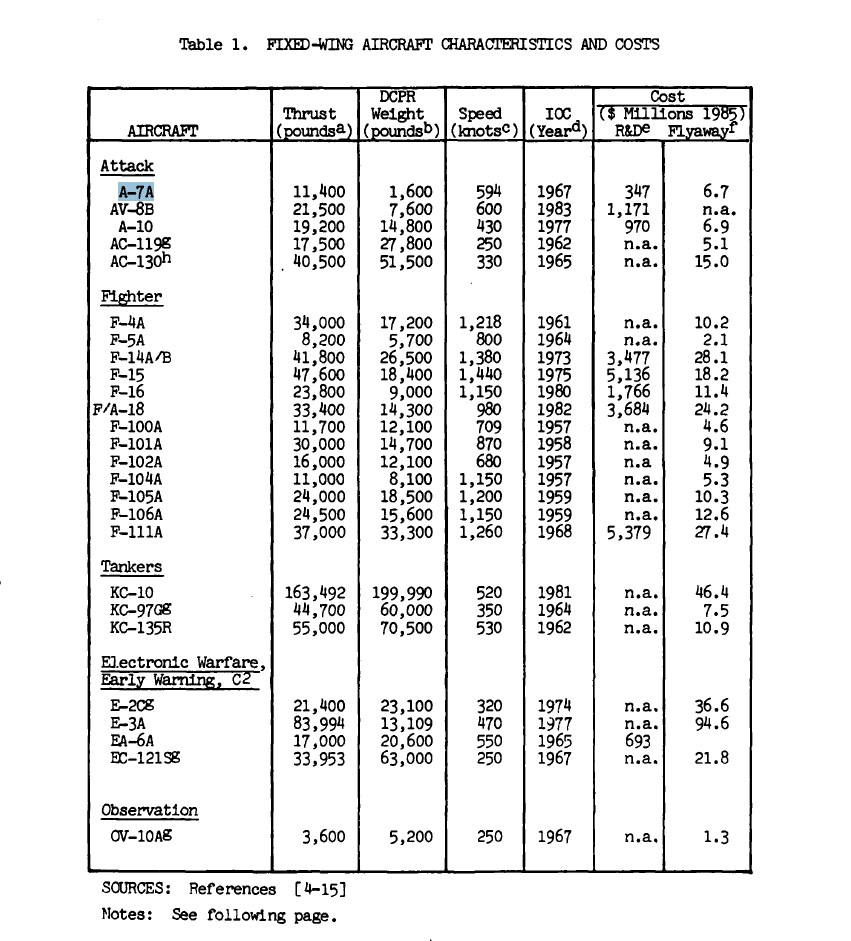 Fixed-wing Costs in 1985 dollars (ADA-A151 575)One reason for the cost differential is obvious: The purchaser doesn’t pay for systems (for example, air-to-air radars) that aren’t on the airplane. What you don’t need, you don’t have to test, buy, maintain, or upgrade. Cost savings made from design tradeoffs are less obvious. The A-10’s design philosophy focused on responsiveness, lethality, survivability, and simplicity. This allowed the Air Force to avoid cost drivers such as high aerodynamic performance. The Hog’s design tradeoffs sacrificed speed for lethality and survivability; its slow speed was a feature, not a bug. In the now almost-forgotten 1974 fly-off between the A-7D and the YA-10, the A-10 had several times the endurance of the faster jet and could operate under weather ceilings where A-7 pilots dared not go.
