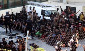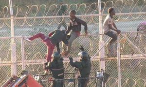 FacebookTwitterPinterest Police help people down from the the border fence between Morocco and Ceuta, Spain. Photograph: Reuters Tv/Reuters
