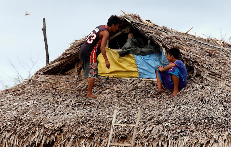 Boys fix the roof of their house in Ilocos Norte Province, northern Luzon on September 14, 2018. © UNICEF/UN0235923/MAITEM