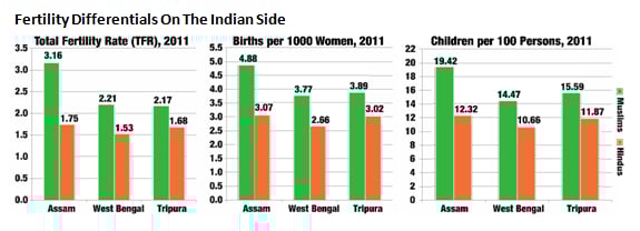 It is widely known and acknowledged that this rise in the share of Muslims in Assam is largely a consequence of the immigration of Muslims from Bangladesh. The process started at the turn of the twentieth century, when the area that now forms Bangladesh was a part of India; and it has continued even after the establishment of an international border between Assam and Bangladesh. From the demographic data, it looks as if the country was never divided. As we see below, within Assam, Muslim fertility far outstrips that of Hindus.