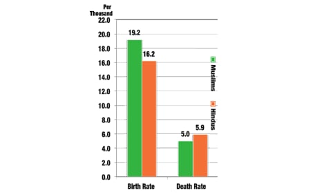 Lower fertility of Hindus is often explained on the basis of higher acceptance of birth control measures among them and other socio-cultural factors. Higher mortality of Hindus is probably related to their conditions of poverty and distress.