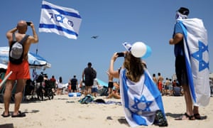 Israelis enjoyed a lavish party last week to mark the nation’s seven eventful decades, but the threat to its existence could hardly have been greater An RAF Hercules takes part in an air show that was part of Israel’s independence celebrations last week. There were fireworks, concerts, torch processions and parties throughout the country. In Jerusalem the night sky was illuminated by 300 drones that coalesced to form images of favourite Israeli symbols,such as the national flag and a dove with an olive branch in its mouth. The celebrations included a live, televised retelling of Jewish history dating to biblical times. In one scene children with yellow stars pinned to their clothes fled marching Nazi soldiers. Another showed pioneers building the fledgling Jewish state.