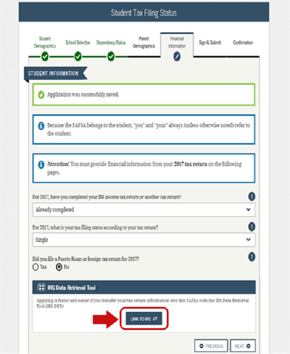 Some applicants find it challenging to enter financial information in the FAFSA form. But, thanks to a partnership with the Internal Revenue Service (IRS), students and parents who are eligible can automatically transfer their necessary 2017 tax information into the 2019–20 FAFSA form using the IRS DRT. It’s the fastest, most accurate way to enter your tax return information into the FAFSA form; if you’re given the option to “LINK TO IRS,” take advantage of it!