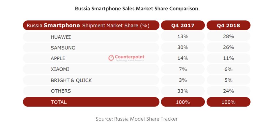 At the end of October, I reported that Huawei’s smartphone business had secured an “extraordinary” 42% share of its home Chinese market, posting 66% sales growth. Well according to a Nikkei report citing research from M.Video-Eldorado, Huawei’s growth in Russia is not far behind, with 37% of the market. While there are different sets of analysis as to actual shipments in Russia, what is clear is that Huawei is on one of its growth tears. According to Counterpoint, in the final quarter of 2017 the Chinese giant had only 13% of the Russian market. A year later, its market share had doubled.