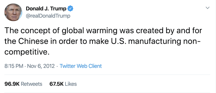 In 2001, then-president George W. Bush withdrew from the Kyoto protocol asserting that it would be too costly for the US economy. And in 2010, the Tea Party movement solidified Republican hostility toward the climate-change issue, preventing Congress from passing a cap-and-trade bill. It came as no surprise then when Donald Trump’s comment that climate change was a “concept created by the Chinese” to make “US manufacturing non-competitive” did little to damage his 2016 presidential campaign.