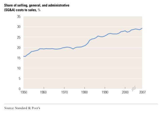 In part, this rising administrative intensity shows the increasing importance of knowledge-based workers and the outsourcing of manual labor. It also reflects a more intense commitment to very complex systems comprising individual parts whose productivity is almost impossible to measure. Despite the claims of IT, marketing, and human resources that their programs generate strong returns on investment, corporations are betting on a whole approach to business, not on any one element. The risk is that in hard times, the system becomes the problem.