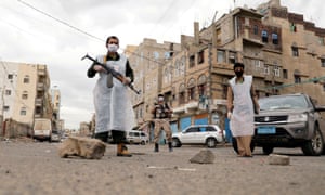 Security men wearing protective masks stand on a street during a 24-hour curfew, in Sanaa, Yemen. Photograph: Khaled Abdullah/Reuters