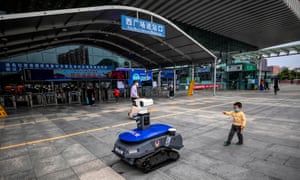 A police robot enforcing coronavirus rules in Shenzhen, China in March. Photograph: Alex Plavevski/EPA