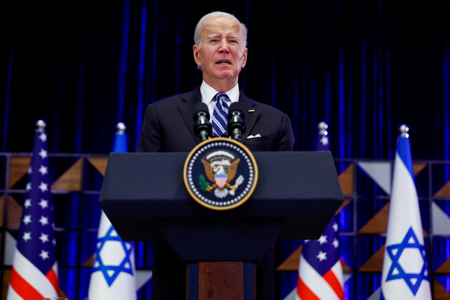 U.S. President Joe Biden delivers remarks as he visits Israel amid the ongoing conflict between Israel and Hamas, in Tel Aviv, Israel, October 18, 2023.