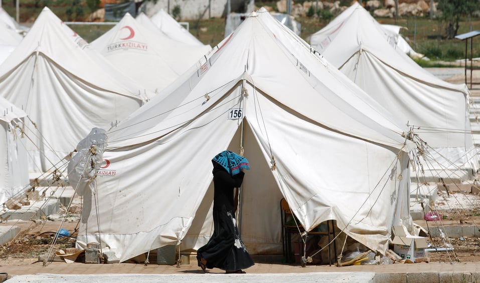 A Syrian woman walks past Turkish Red Crescent tents at Reyhanli refugee camp on the Turkish-Syrian border in 2012. Turkey has sheltered millions of Syrian refugees.
