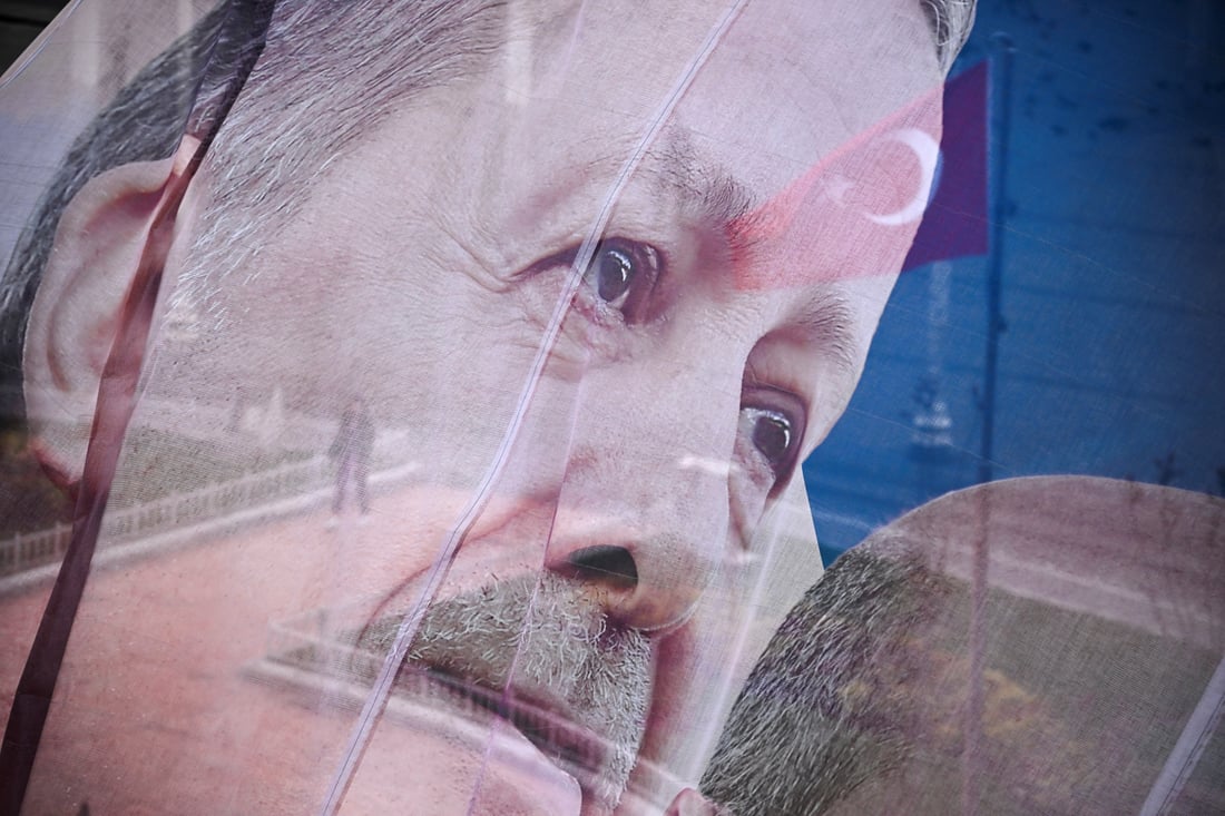 A person walks behind a flag with an image of Erdoğan ahead of the presidential and parliamentary election in Istanbul in May 2023.
